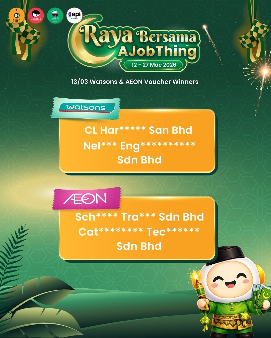 We are pleased to announce the companies selected as winners for the Raya Bersama AJobThing campaign. Company names are partially displayed for privacy purposes.