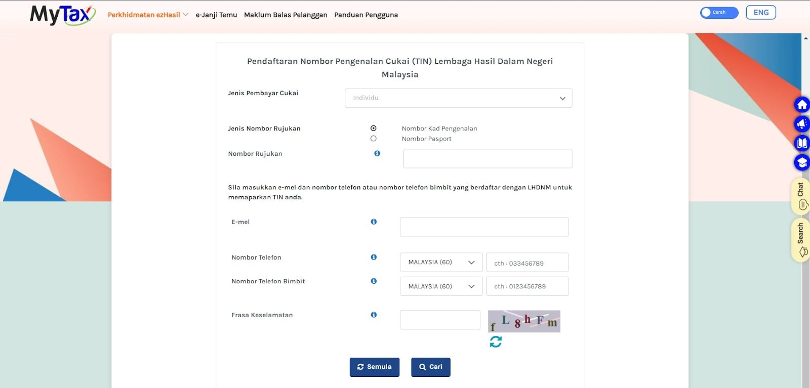 Click on “Jenis Pembayar Cukai” and select “Individual”. Next, in the “Reference Number” field, enter your IC number (MyKad number).