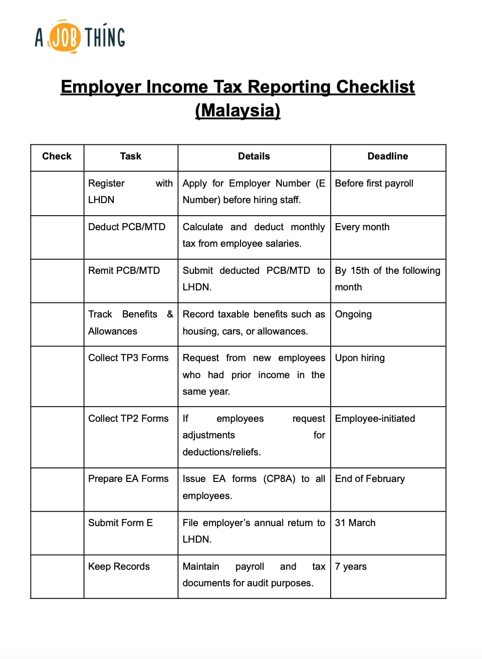 Hire NowEvery employer in Malaysia is responsible for handling income tax deductions and reporting on behalf of their staff. These duties include registering with LHDN, issuing EA forms, submitting Form E, and making monthly PCB remittances. Failure to follow the rules not only risks financial penalties but also damages trust with employees.