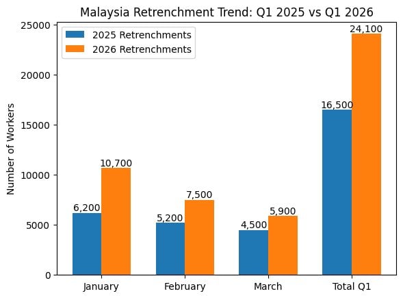 Malaysia saw a strong increase in job losses in the first quarter of 2026, with 24,100 workers retrenched, a 47% increase compared to the same period last year.