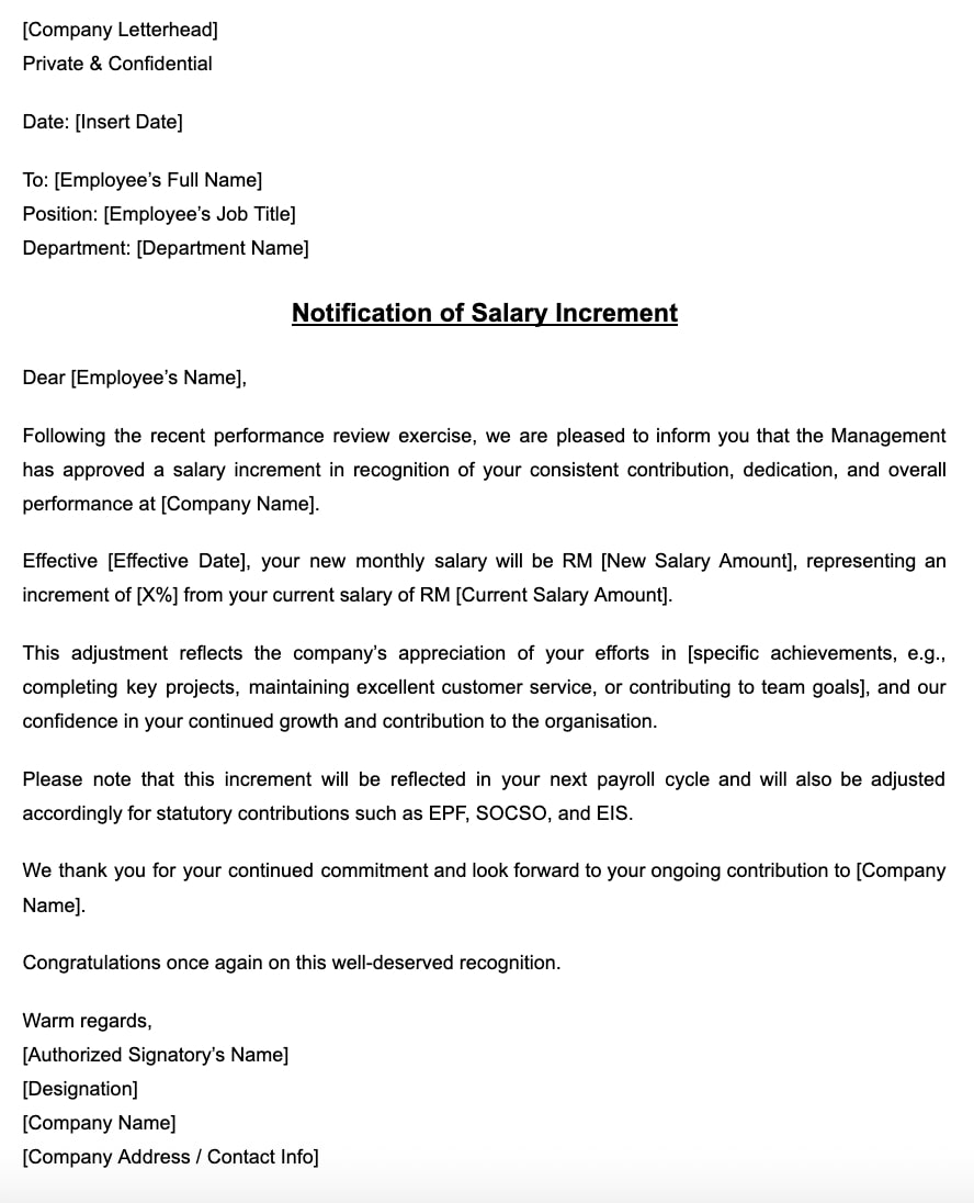 Here’s a sample salary increment letter you can adapt for your company’s HR use in Malaysia.