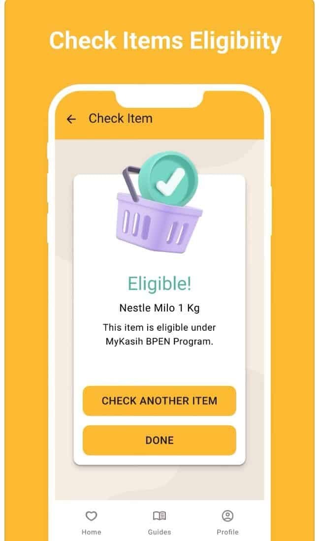 The easiest way is through the MyKasih app because it shows updated item eligibility by barcode search.